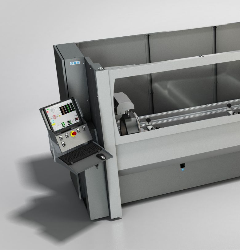 Centro di lavoro a montante mobile con mandrino verticale e 4 assi comandati da controllo numerico compresa la rotazione del piano morse in continuo che permette ogni angolazione compresa da -90° a +90°